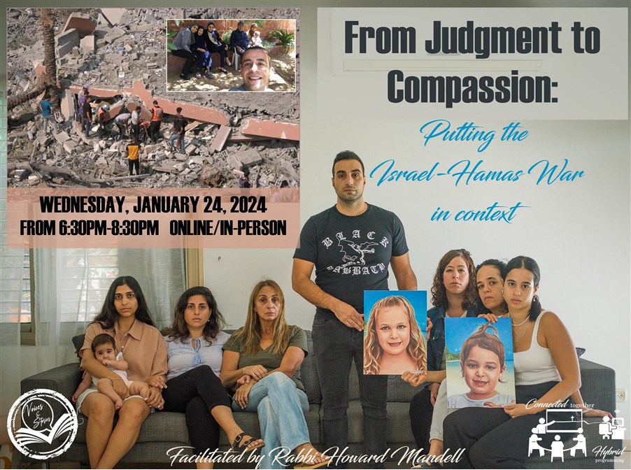 Opening our hearts to the pain felt by both Israelis and Palestinians requires us to appreciate and understand the complex history of the modern-day Middle East. Join us for on Wednesday, January 24th as Rabbi Howard Mandell shares the relevant history underlying the ongoing and current conflict with Israel, Gaza, and Hamas, and offers the subtle but important distinctions between anti-Semitism, anti-Zionism, and anti-Israel.