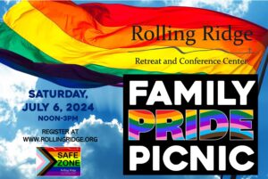 All are invited to join us for our first Family Pride Picnic at Rolling Ridge on Saturday, July 6th as we celebrate the diversity of how our Creator God has made us. We will gather around the picnic tables of Rolling Ridge and enjoy a delicious lunch with games, music, vendors, and resources to support and encourage families as they learn to fully embrace the beauty of each member.